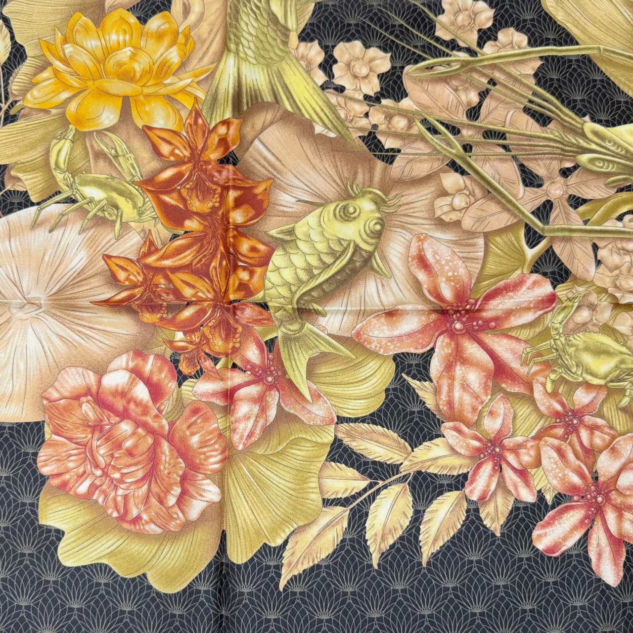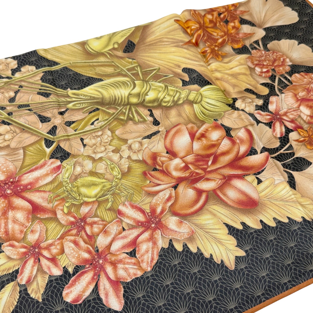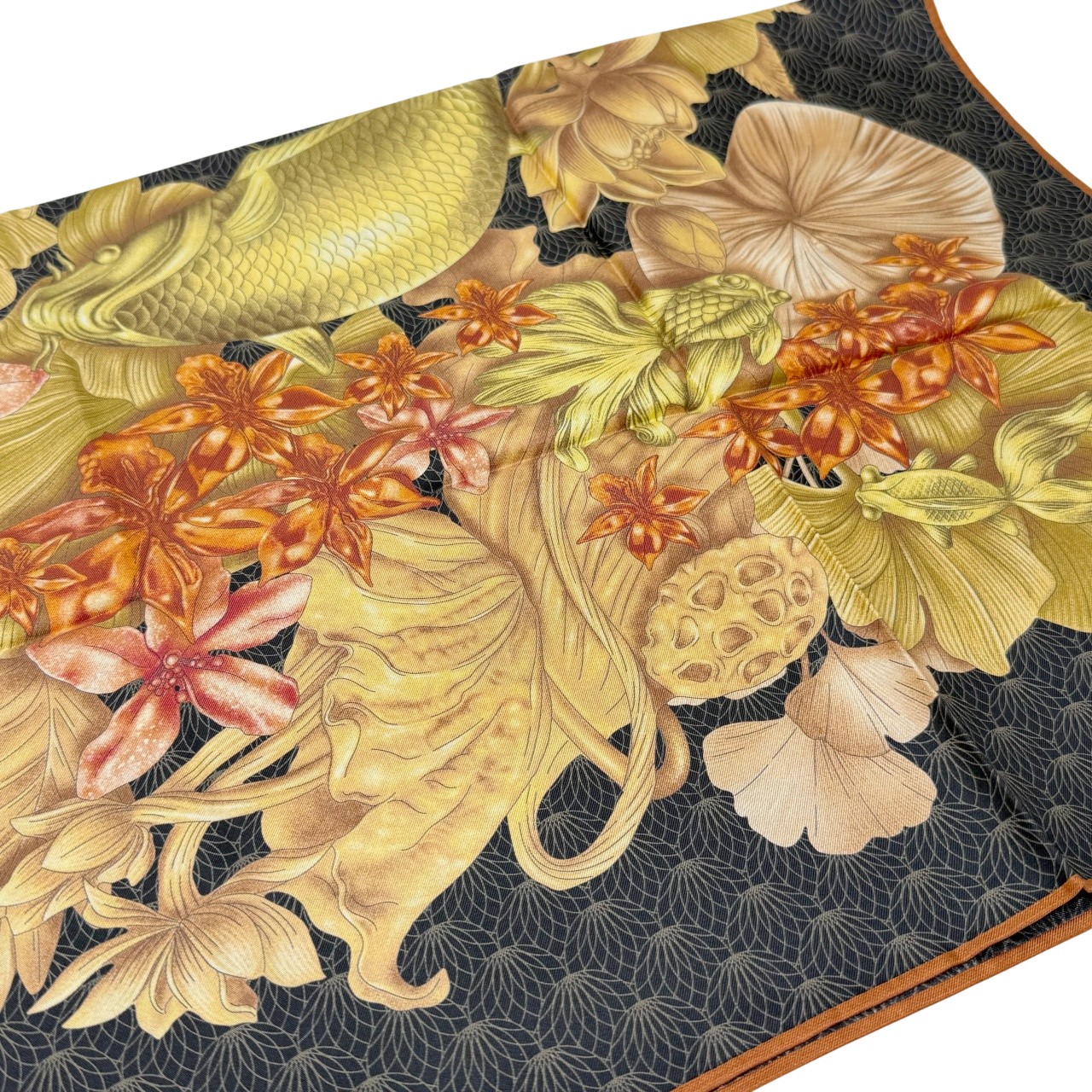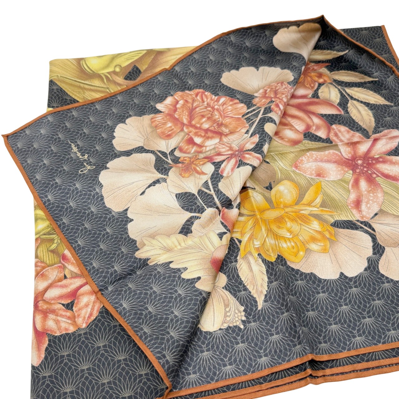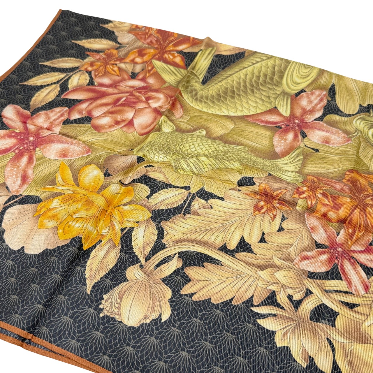 深みのあるダークトーンをベースに、ゴールドやオレンジを基調とした花々と鯉を描いた、存在感のあるシルクスカーフ。