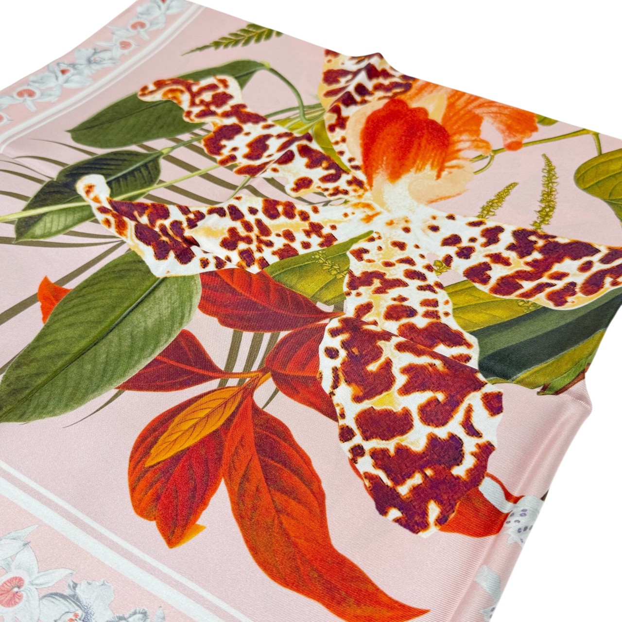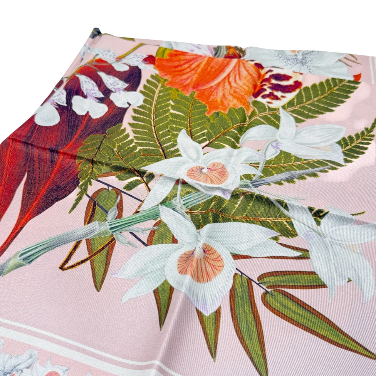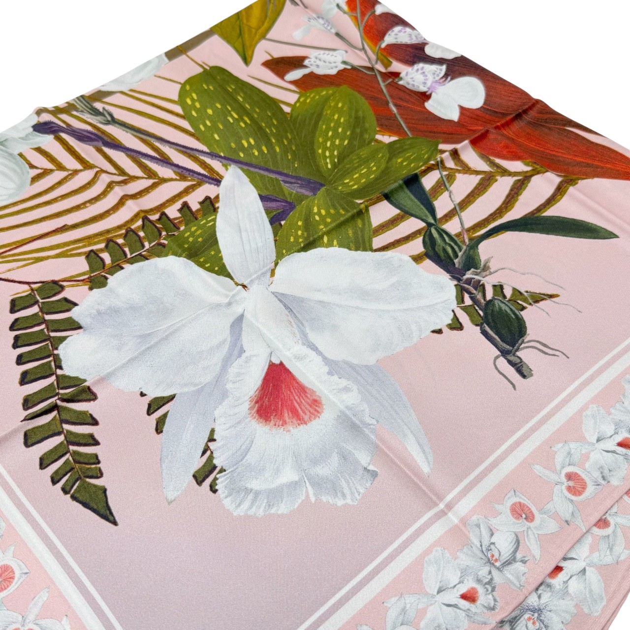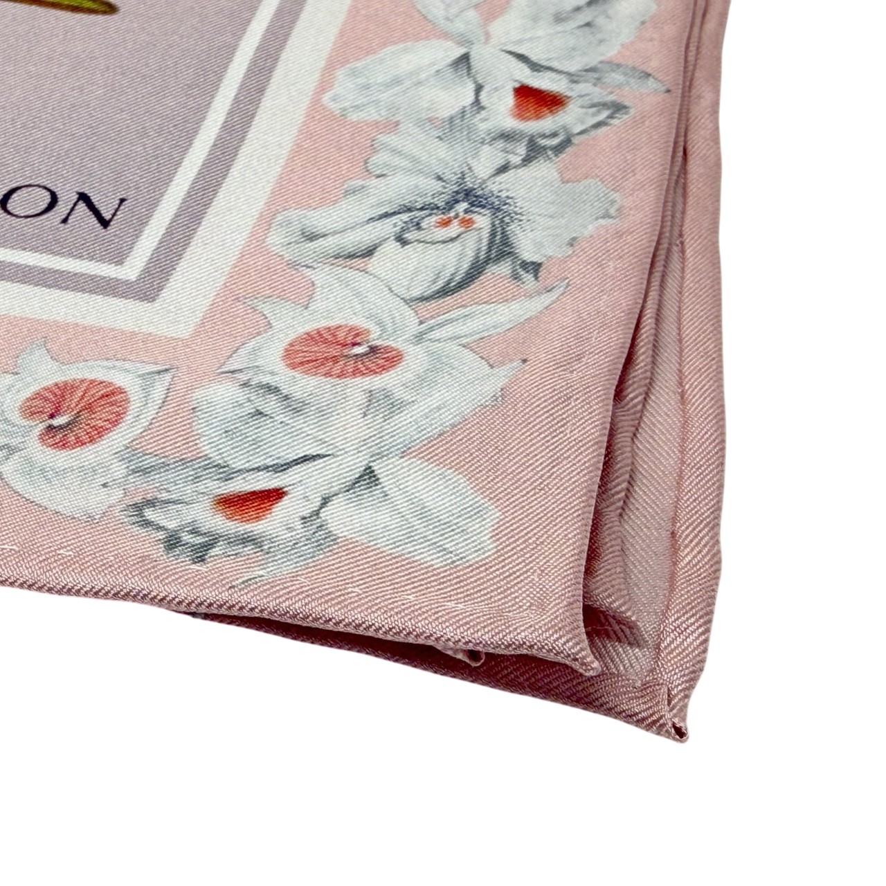 やわらかなピンクをベースに、花や植物を繊細に描いたエレガントなシルクスカーフ。